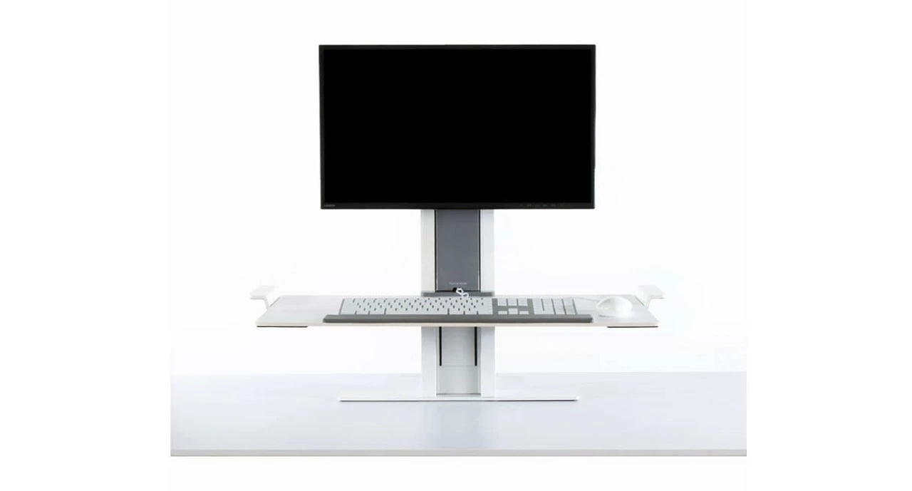 Take your workstation to the next level with the QuickStand Height Adjustable Workstation with Single Monitor by Humanscale. Fixed height desks are on the way out and sit-stand desks are quickly taking their place. Now you have an adjustable desk without having to splurge on a whole new setup. Just clamp mount to your current workstation, install your monitor and stow your keyboard and mouse combo on their own plane. This all-inclusive platform is sleek, can help you manage desk space, and increases productivity throughout the day. Ergonomic living, meet simplicity.