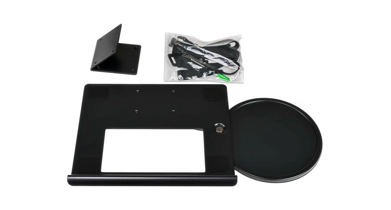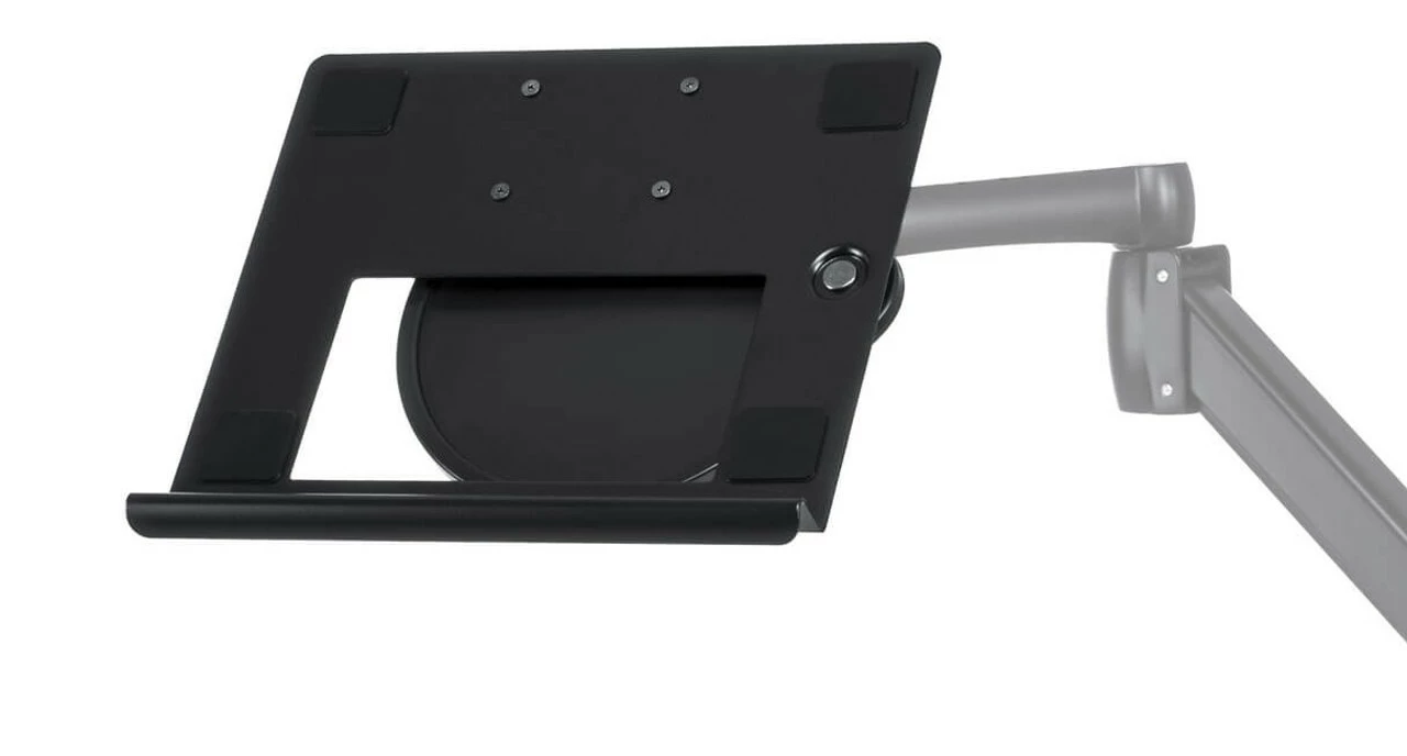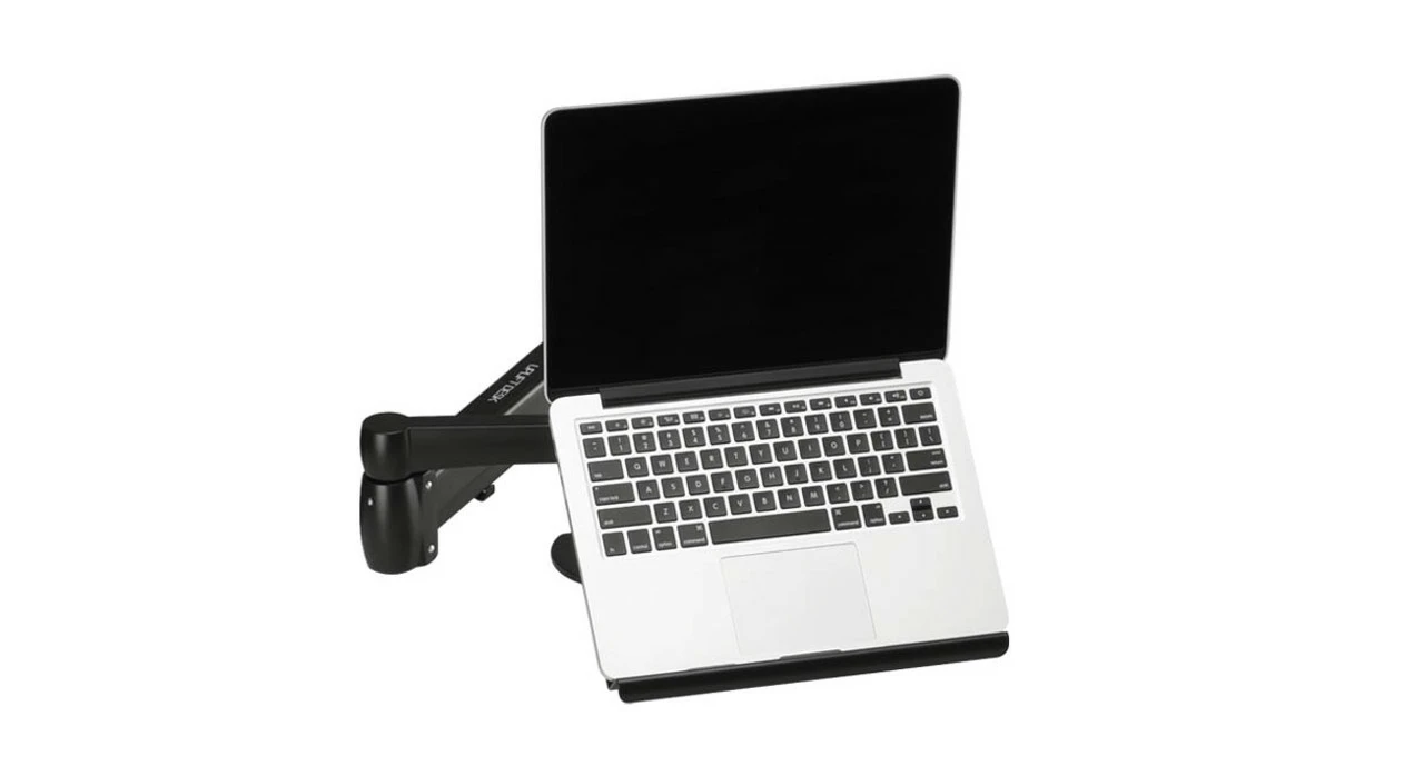 The large front lip on the sturdy metal frame keeps your laptop in place as you move it around with your monitor arm. A set of elastic straps provide extra security, ensuring that your computer won’t slip as it moves back and forth.