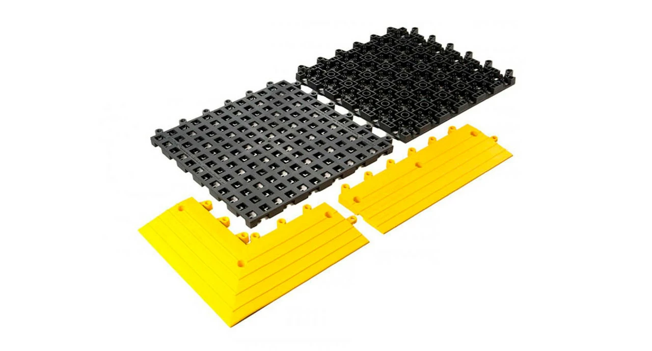 The Wearwell 560 ErgoDeck Open Grid Tiles and Ramps create a comfortable, ergonomic flooring layer for manufacturing or industrial facilities. Large 18″ x 18″ tiles interlock to form a grid of any size or shape that is needed, and can be unlocked and repositioned at any time. Wearwell 560 ErgoDeck Open Grid Tile is not only versatile, but ergonomic. Made from 7/8″ of silicone-free PVC, these tiles offer excellent anti-fatigue support and are a great way to prevent safety hazards. Also available with corners and ramps.