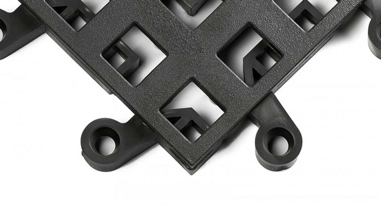 - Each tile has six interlocking connectors to prevent separation; countersunk holes for semi-permanent installations